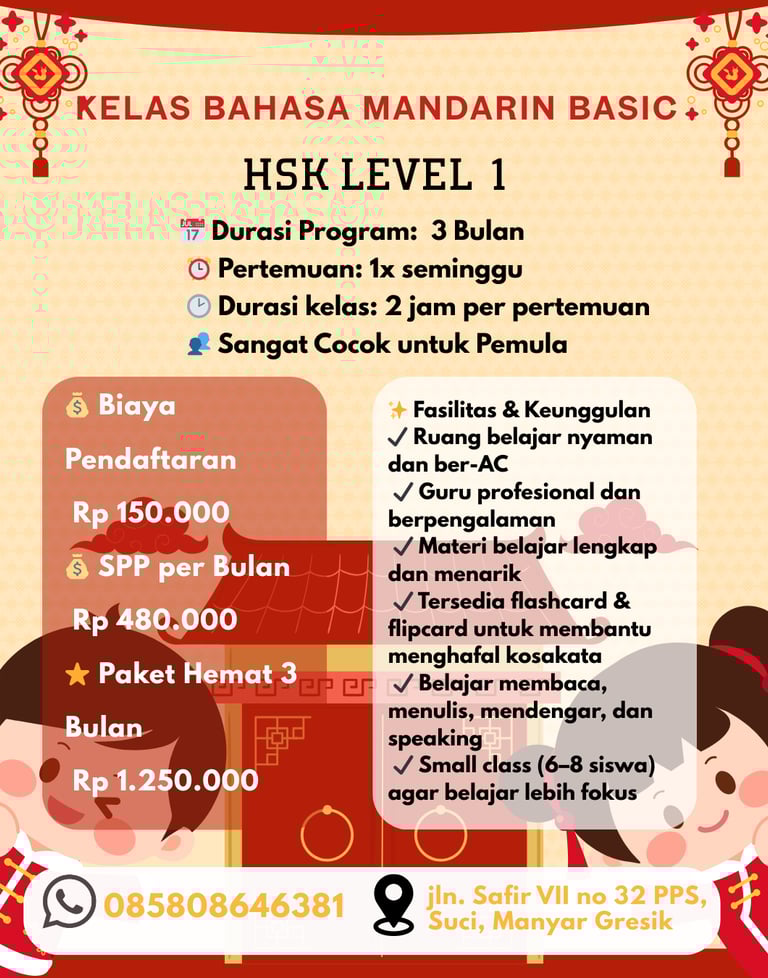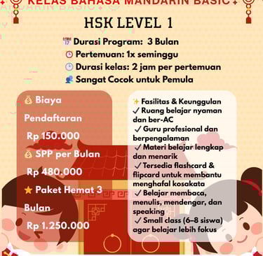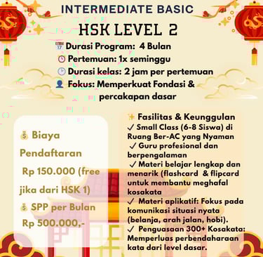 Persiapan ujian HSK 1 hingga 4 dengan modul lengkap dan simulasi tes berkala.